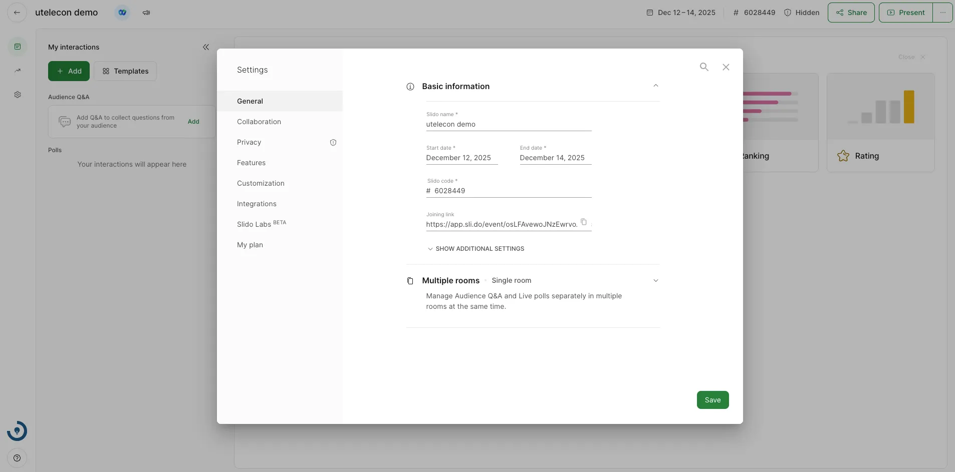 - Language: You can set the language displayed to participants. To display in English, click “SHOW ADDITIONAL SETTINGS” under “Basic information”, select “English (US)” from “Language”, and save.