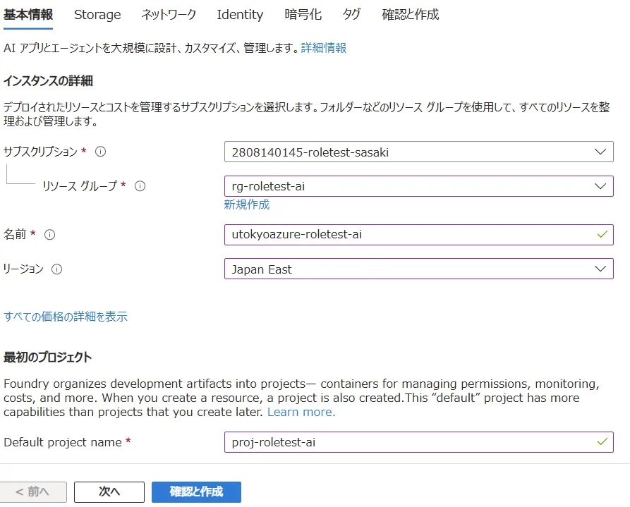 rg-roletest-aiというリソースグループ名で作成し,以下に作成される各リソースをまとめます.まとめられたリソースは,権限の継承や削除などを一括で対応することが可能となります. - リージョン:Foundryをどの地域(リージョン)にあるデータセンターにデプロイするかを指定します.使いたい機能が特定の国のリージョンにしかない場合は,その国のリージョンを選択ください.