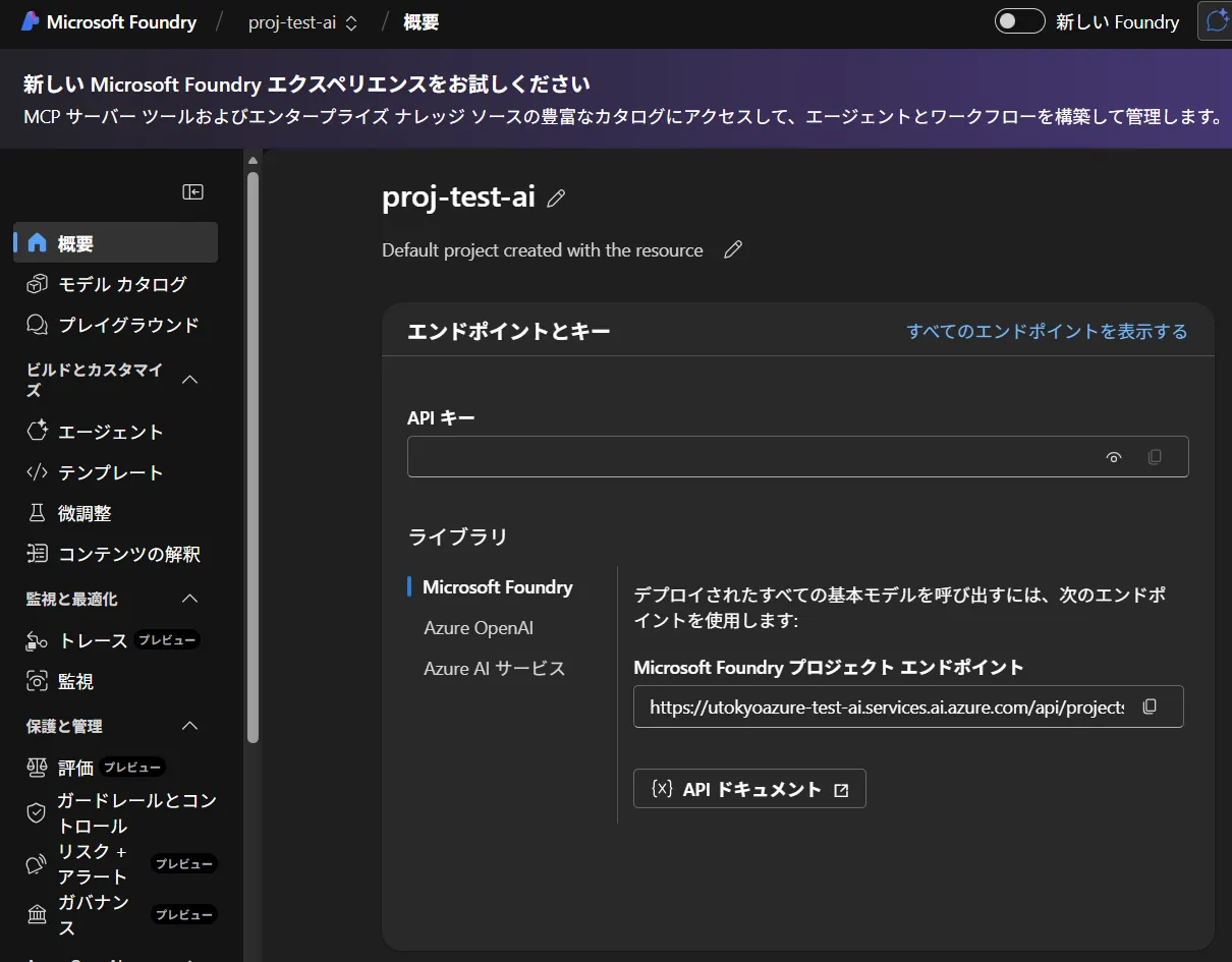 新しいFoundryスイッチを切り替えると,UIが新しいバージョンに更新されます.本ページでは旧バージョン(クラシック版)で説明していますのでご注意ください.新しいバージョンのUIで使う場合は,Microsoft Learn のMicrosoft Foundry(新しい)ポータルを参照してください.