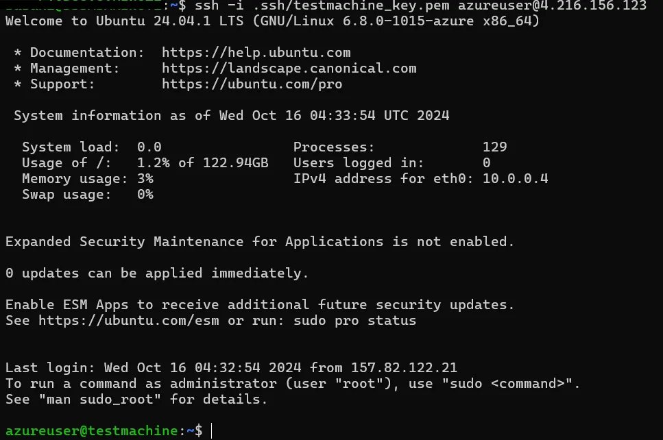 • ssh -i [ダウンロードした秘密鍵] azureuser@[IPアドレス]