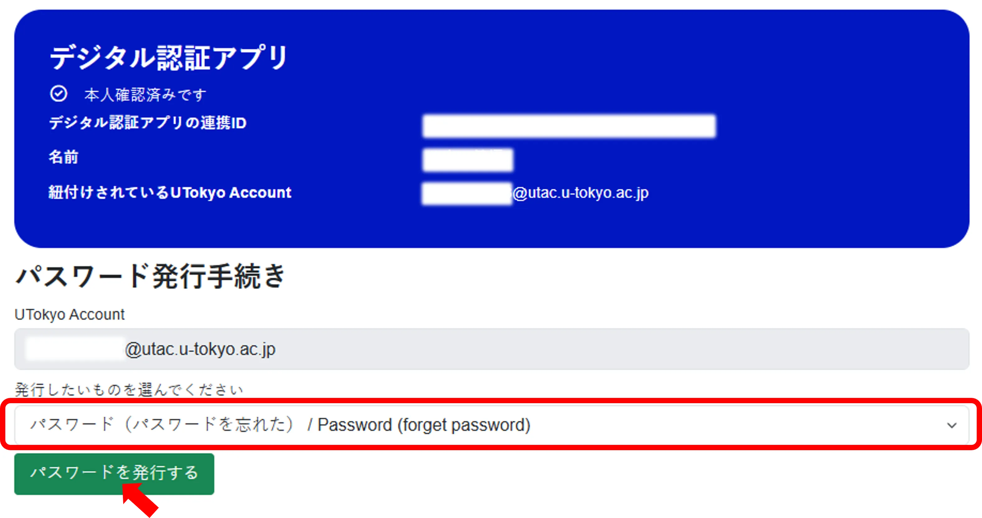 「発行したいものを選んでください」の欄で「パスワード(パスワードを忘れた)」を選択して,「パスワードを発行する」を押してください.