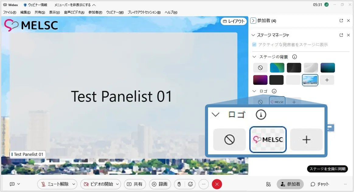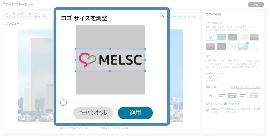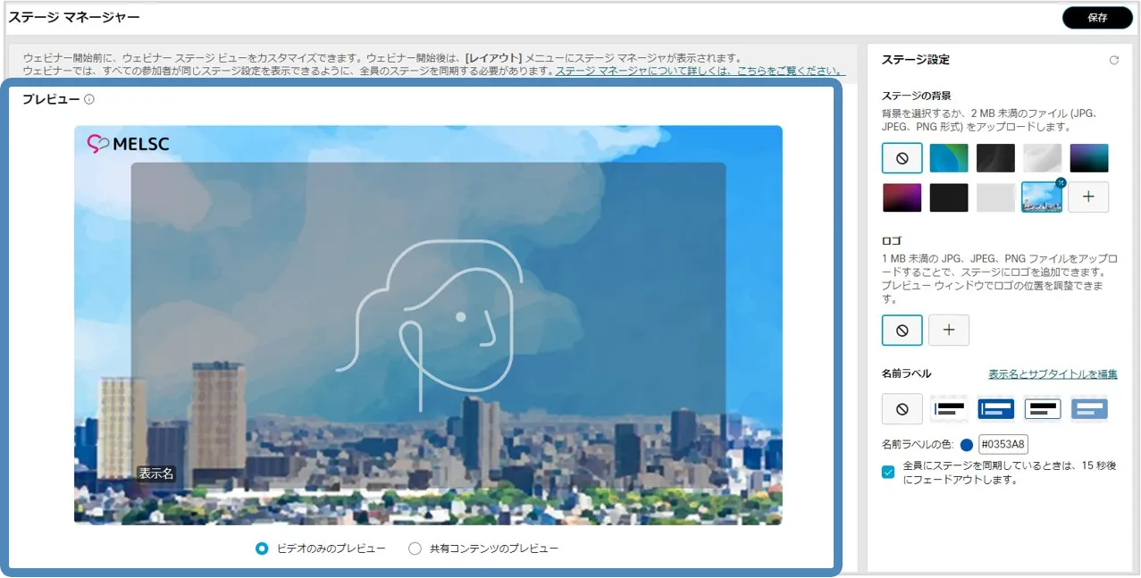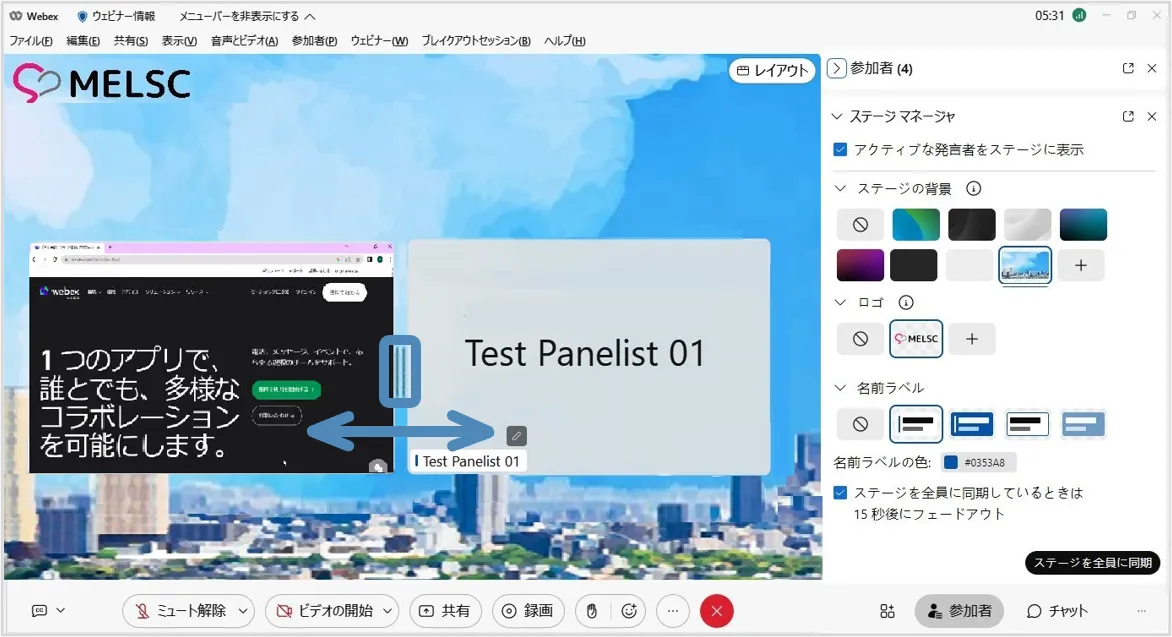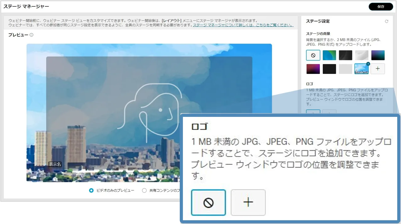 ステージマネージャー機能を使用すると,背景やロゴ・カスタマイズした名前ラベルをステージに設定でき,効果的なウェビナーの開催に貢献します.