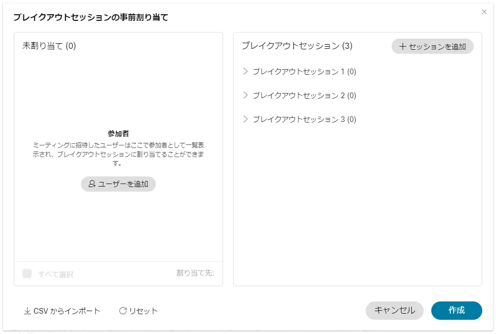 「ブレイクアウトセッション」ボタンを押すと,ブレイクアウトセッションの割り当てウィンドウが表示されます.