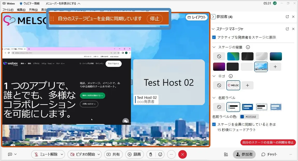 ※停止した場合,出席者はステージマネージャーで設定した背景などは利用することはできません.再度「同期」するとステージマネージャーで設定したレイアウトを使用できます.
