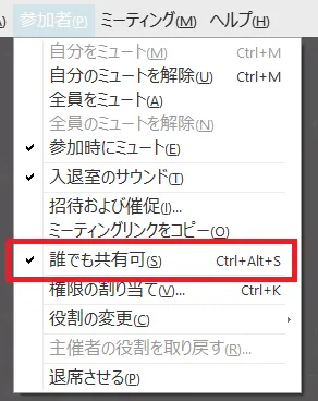 「参加者」メニューに「誰でも共有可」という機能があり,このチェックを外しておくと,想定していない参加者からのコンテンツ共有を防ぐことができます.