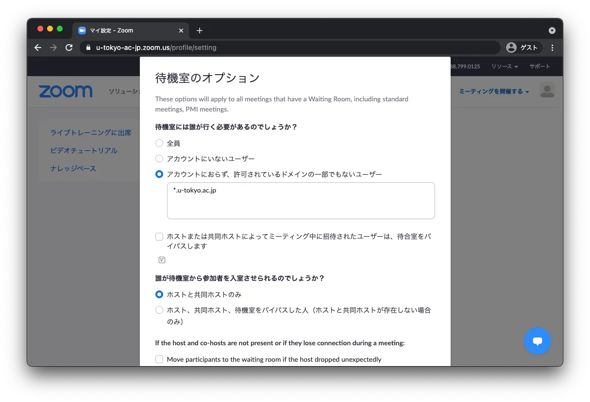 - 大学アカウントでサインインしたユーザは待機室に入れない(自動的に入室許可する)という設定